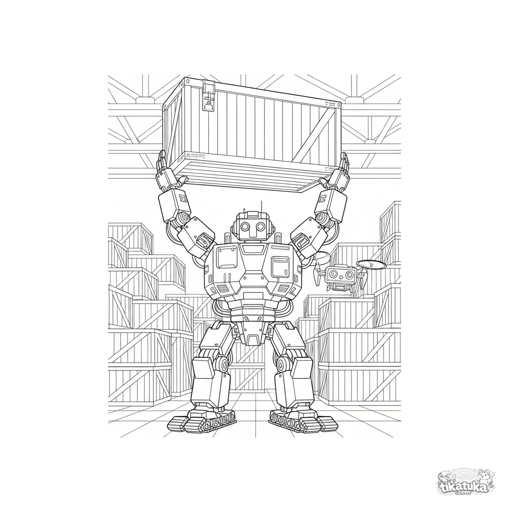 Detailed coloring page for ages 10-12: a powerful industrial lifter robot with treads hoists a large crate in a vast warehouse. Detailed hydraulics, rows of boxes, a flying drone.