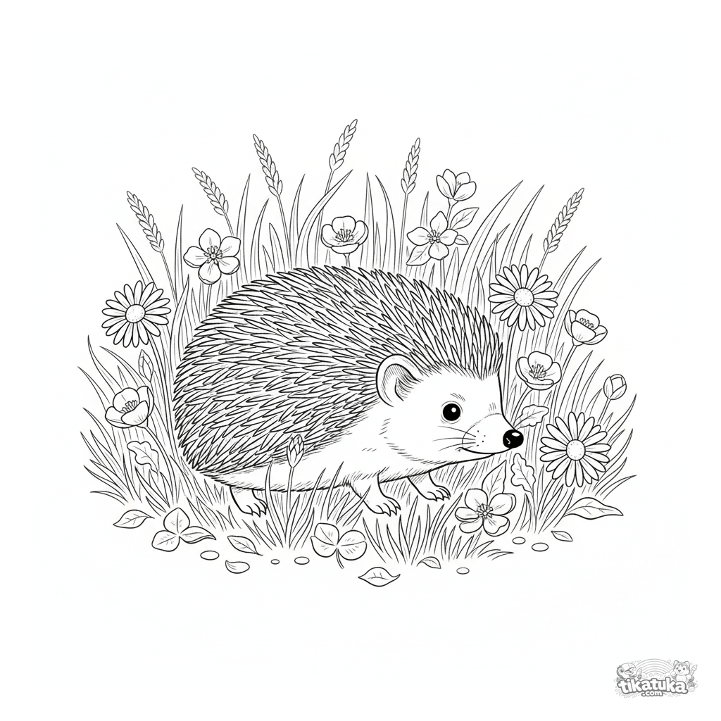 Detailed coloring page for kids 7-12: a hedgehog with a curious expression explores a spring meadow full of wildflowers. Stylized engraving look, clean lines.