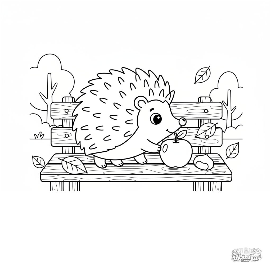 Coloring page for kids 4-6: a hedgehog on a park bench trying to manage a large apple, with autumn leaves and a chestnut nearby.