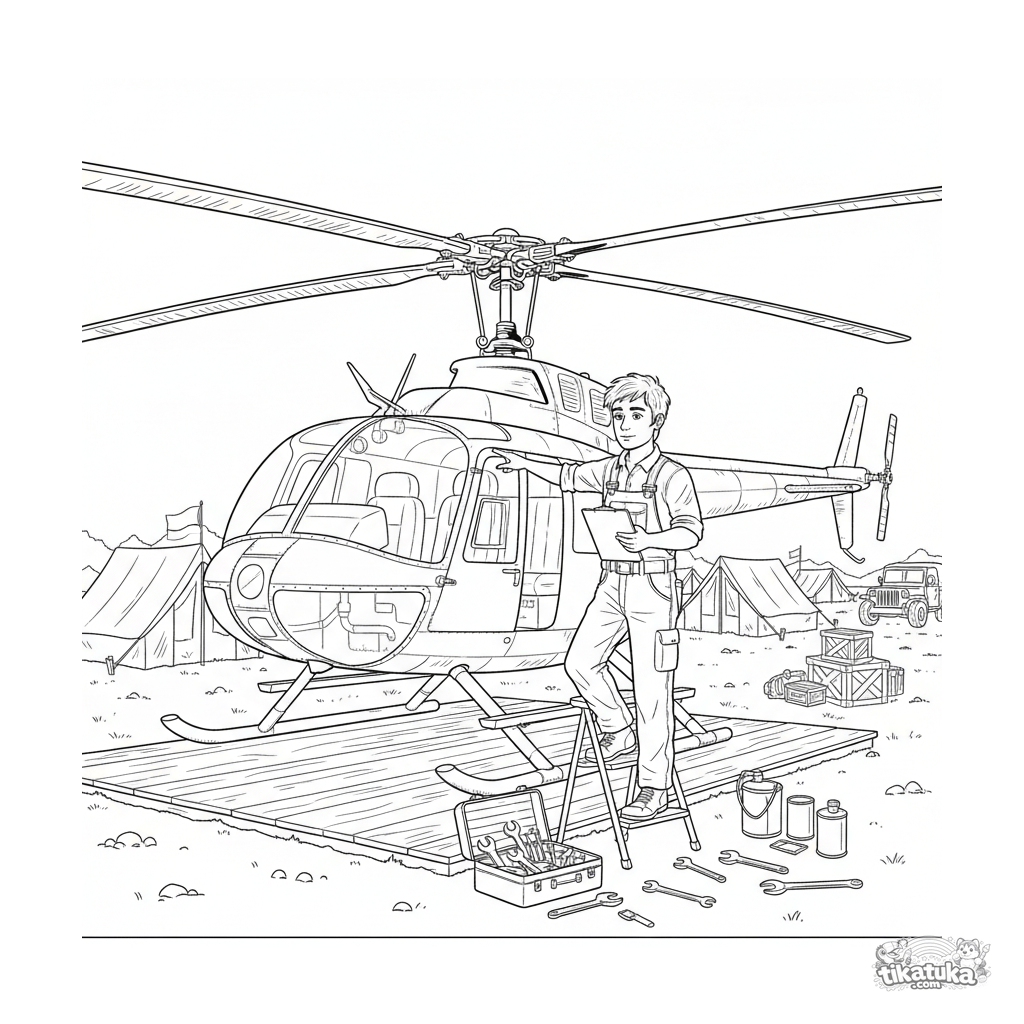 Detailed coloring page for ages 10-12: a mechanic inspecting the rotor of a helicopter on a makeshift pad near a field HQ. Intricate scene with tools.