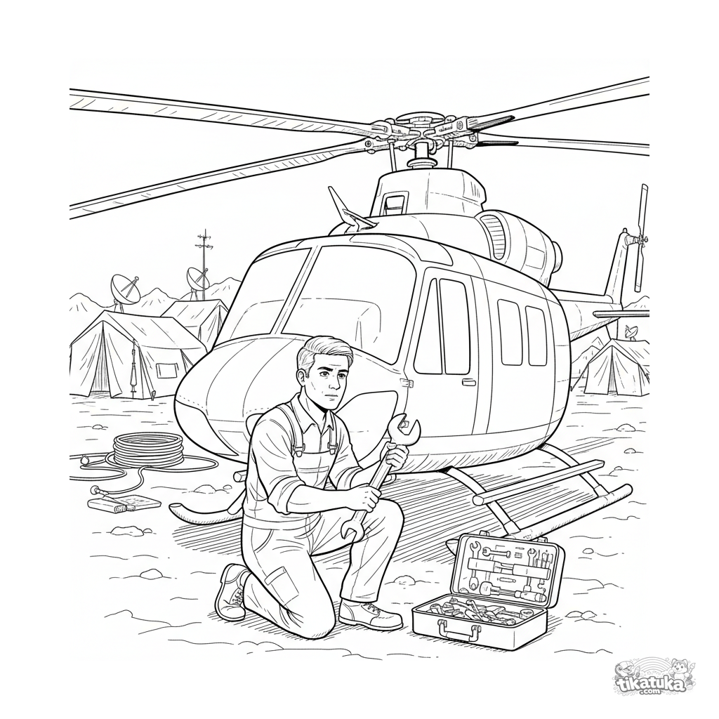 Detailed coloring page for ages 10-12: a mechanic inspecting a helicopter rotor on a landing pad near a field HQ with tents. Realistic outlines, many elements for creative coloring.