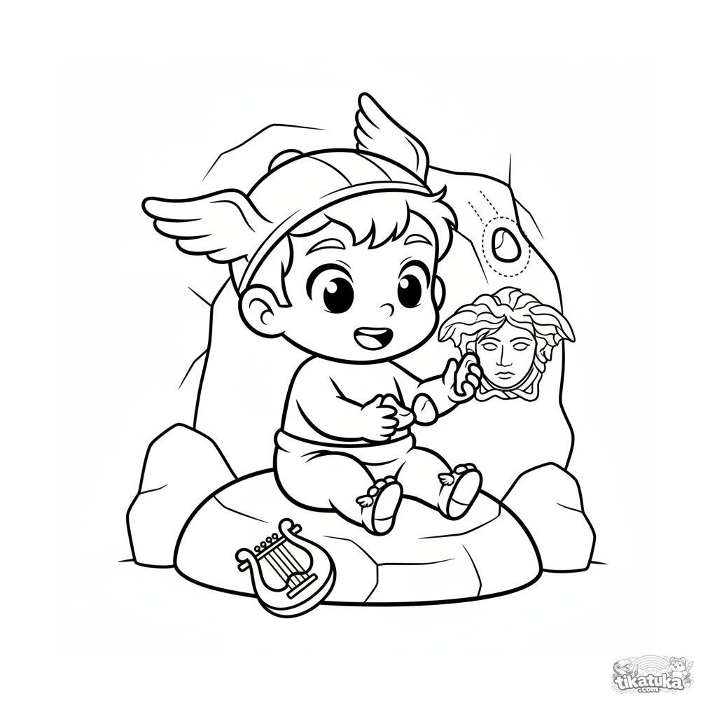 Simple anime-style coloring page for toddlers 2-3: baby Hermes with winged sandals happily plays jacks on the floor of the Gorgon's lair.
