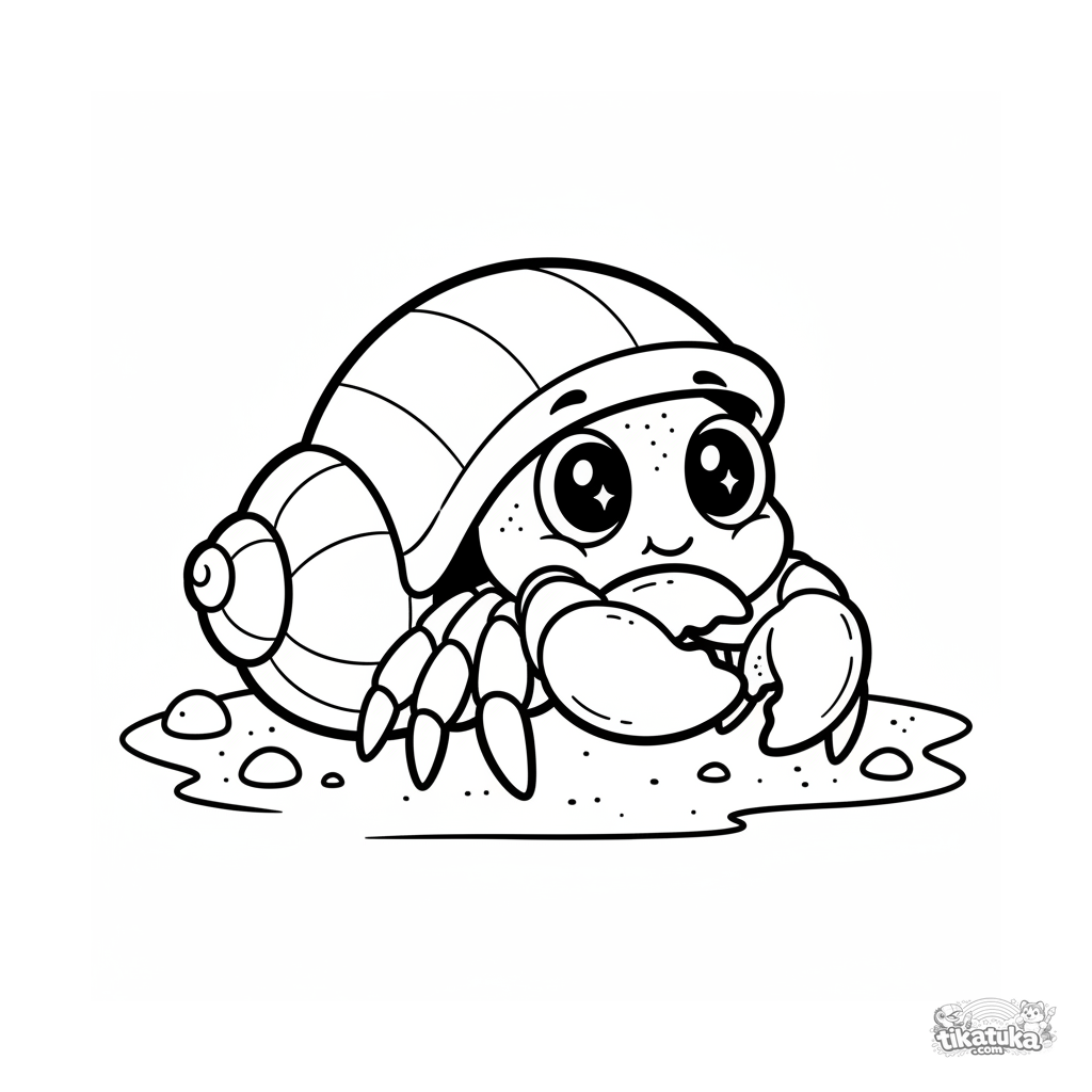 Simple toddler coloring page of a hermit crab peeking from its shell on sunny sand. Large shapes, wide margins, for ages 2-3.