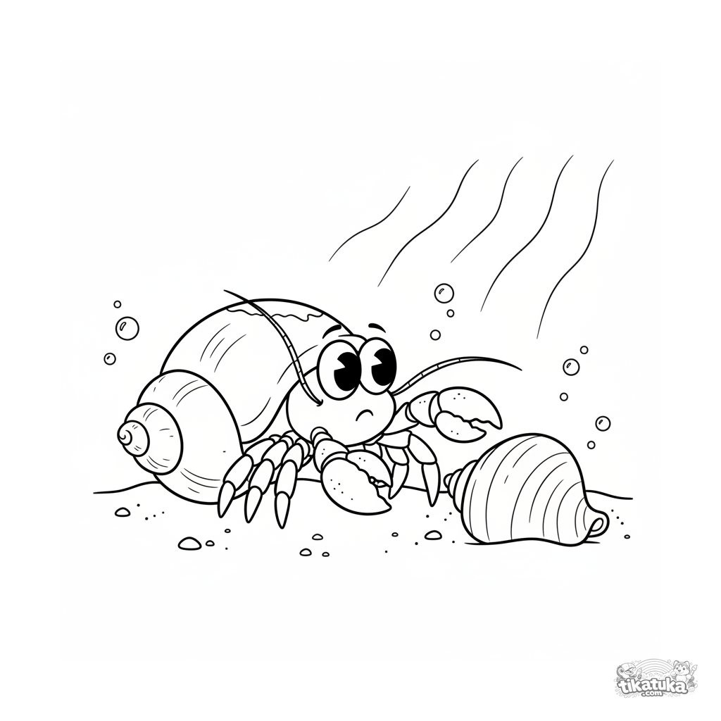 Coloring page of a hermit crab swapping its shell home in a sunbeam on the shallow sandy bottom. A detailed scene for tweens aged 7-9.