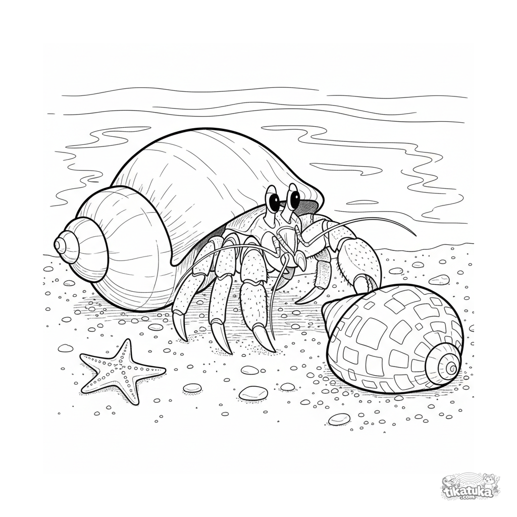 Detailed coloring page of a hermit crab swapping shells on a sandy bottom in sunbeams. For older kids 10-12, with realistic details and wide margins.