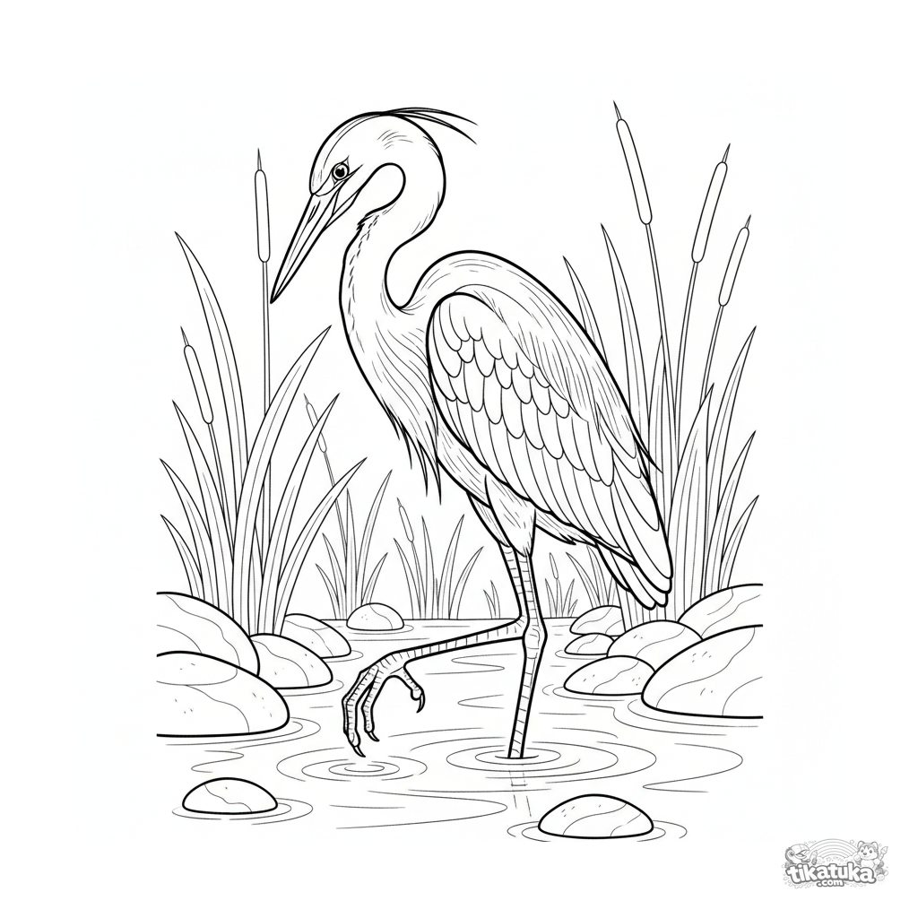 Realistic coloring page for ages 10-12: a grey heron stands still in the clear water of a stream, hunting for fish. Detailed bird illustration in its natural habitat.