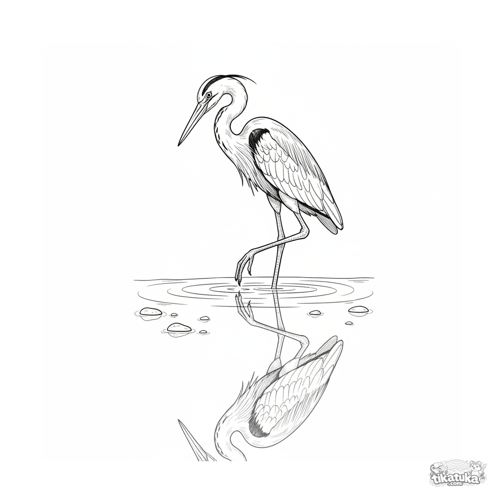 Intricate coloring page for kids 10-12: a heron standing in the clear water of a stream. Styled like a vintage engraving, with details of reflection and anatomy.