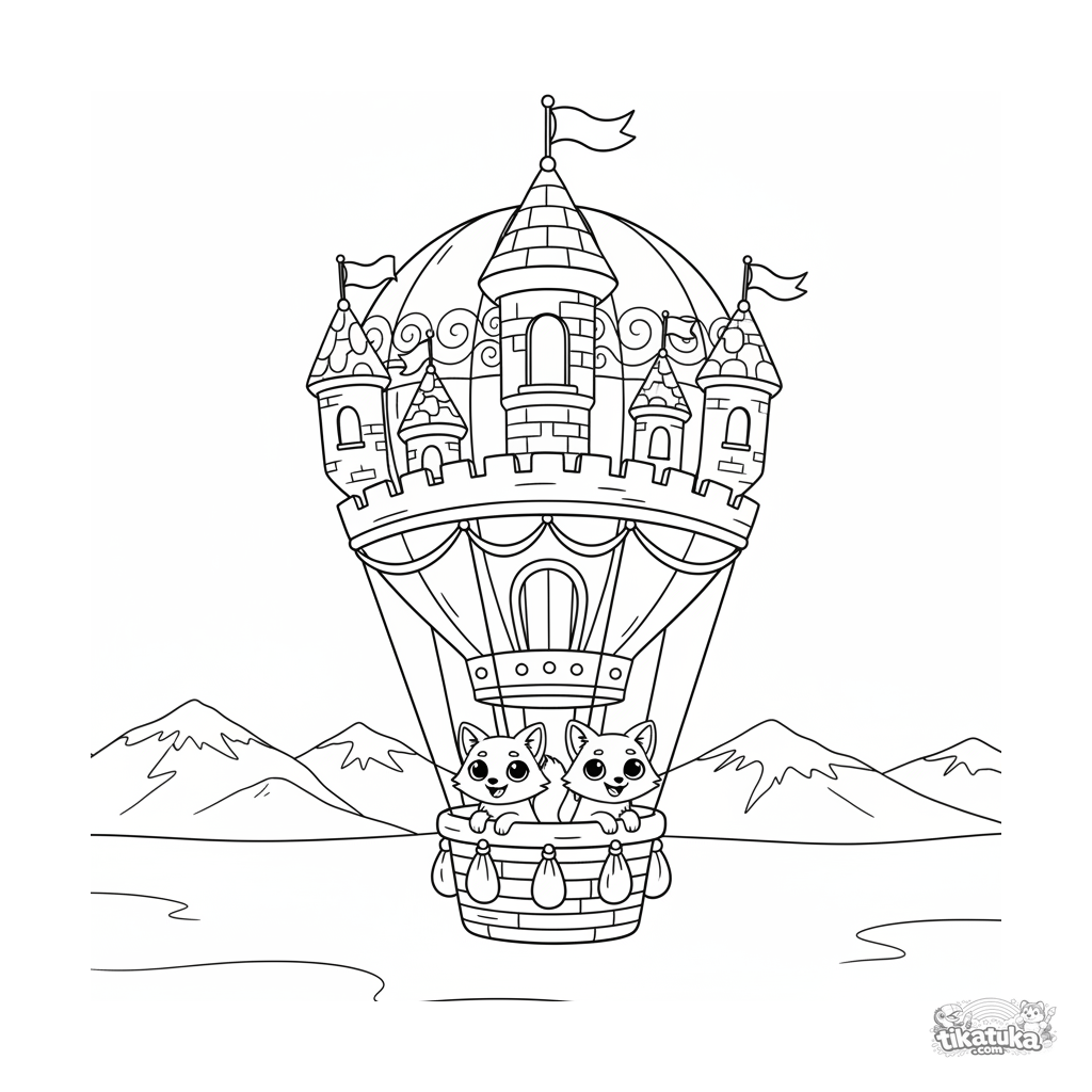 Coloring page of a magical castle-shaped hot air balloon floating over a snowy tundra. For kids aged 4-6. Arctic fox passengers in the basket, soft storybook outlines.