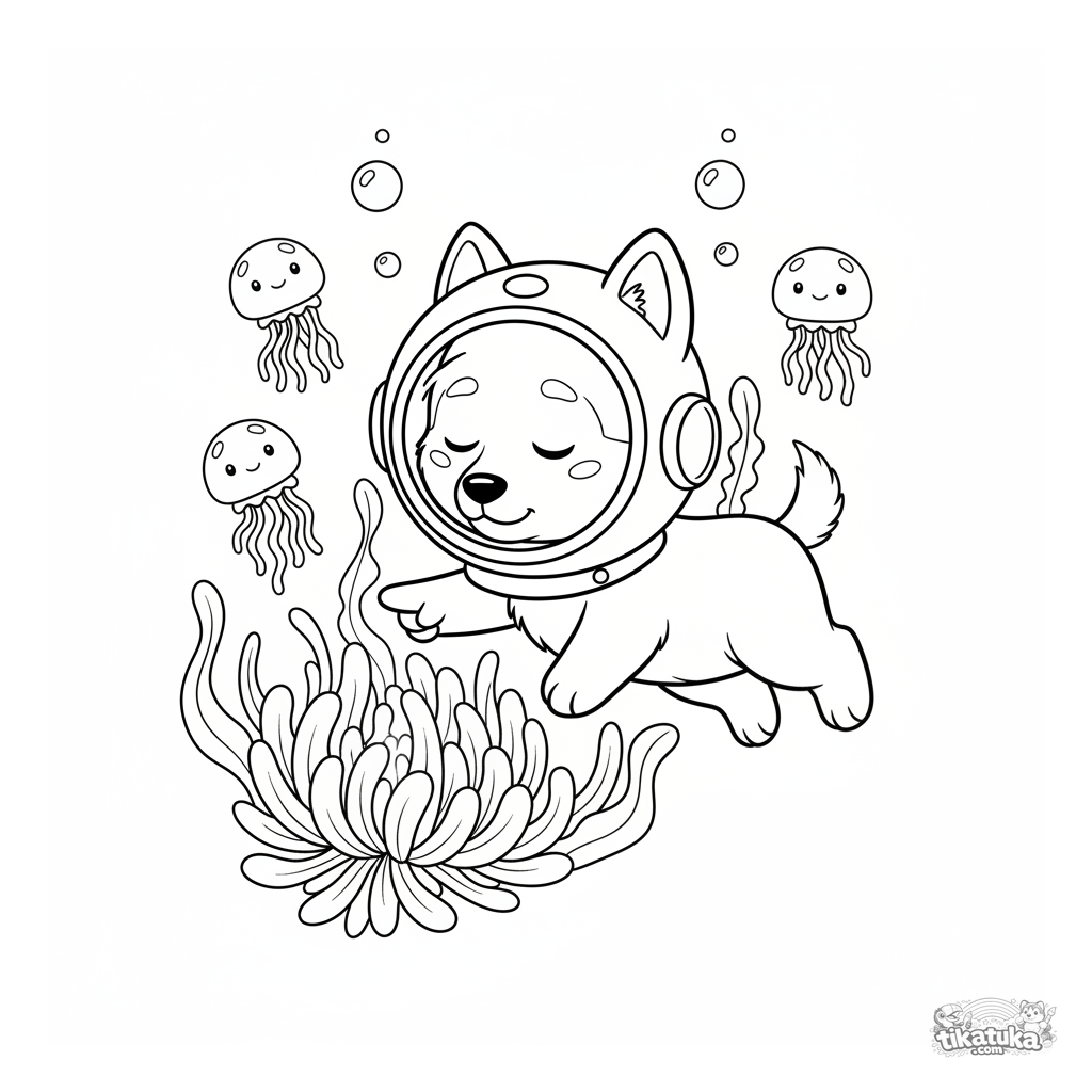 Coloring page for kids 4-6: Husky Lutik in a diving helmet swims among jellyfish in the ocean depths. A calm and magical underwater scene.