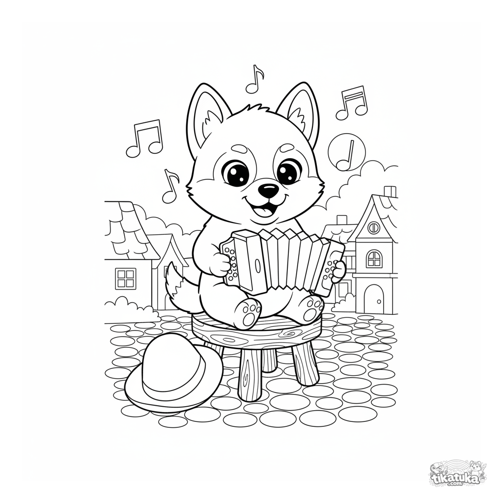 Music coloring page: a husky plays an accordion in a village square. Happy music notes, simple background, for ages 5-10.