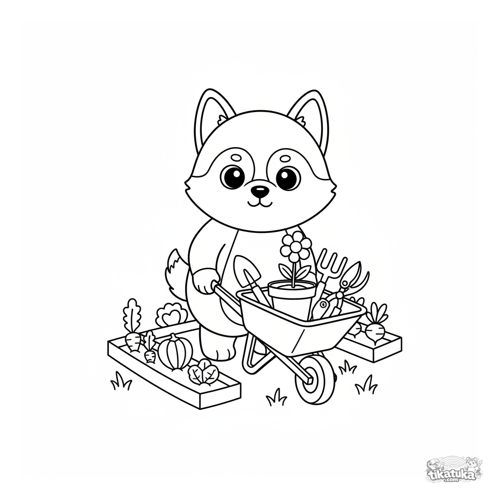 Coloring page for kids 4-6: a husky puppy helps in the garden, pushing a wheelbarrow with tools. Cute and simple scene for creativity.