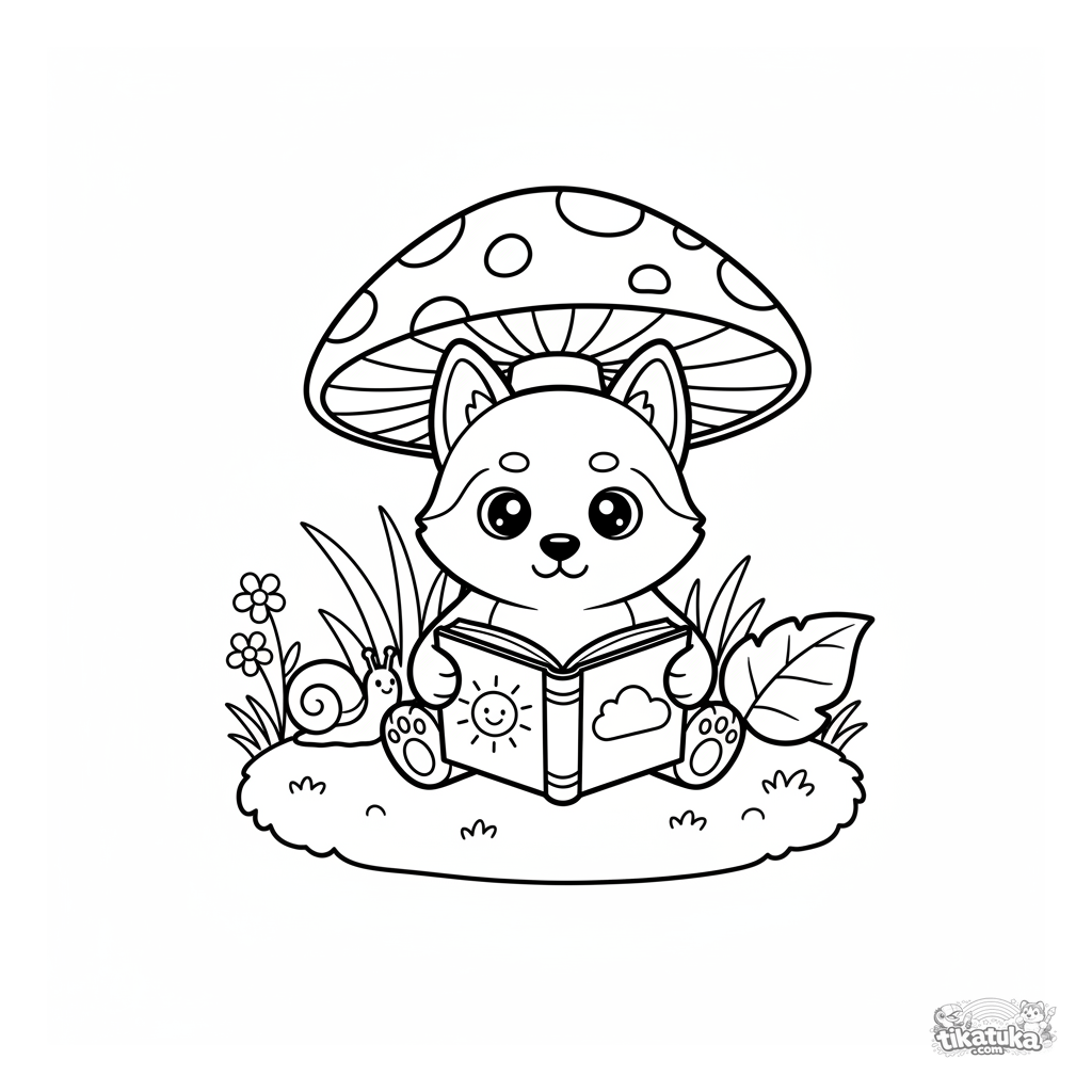 Coloring page for kids 4-6: a husky puppy reads a book under a big mushroom in the forest. Simple lines, cute scene for creativity.