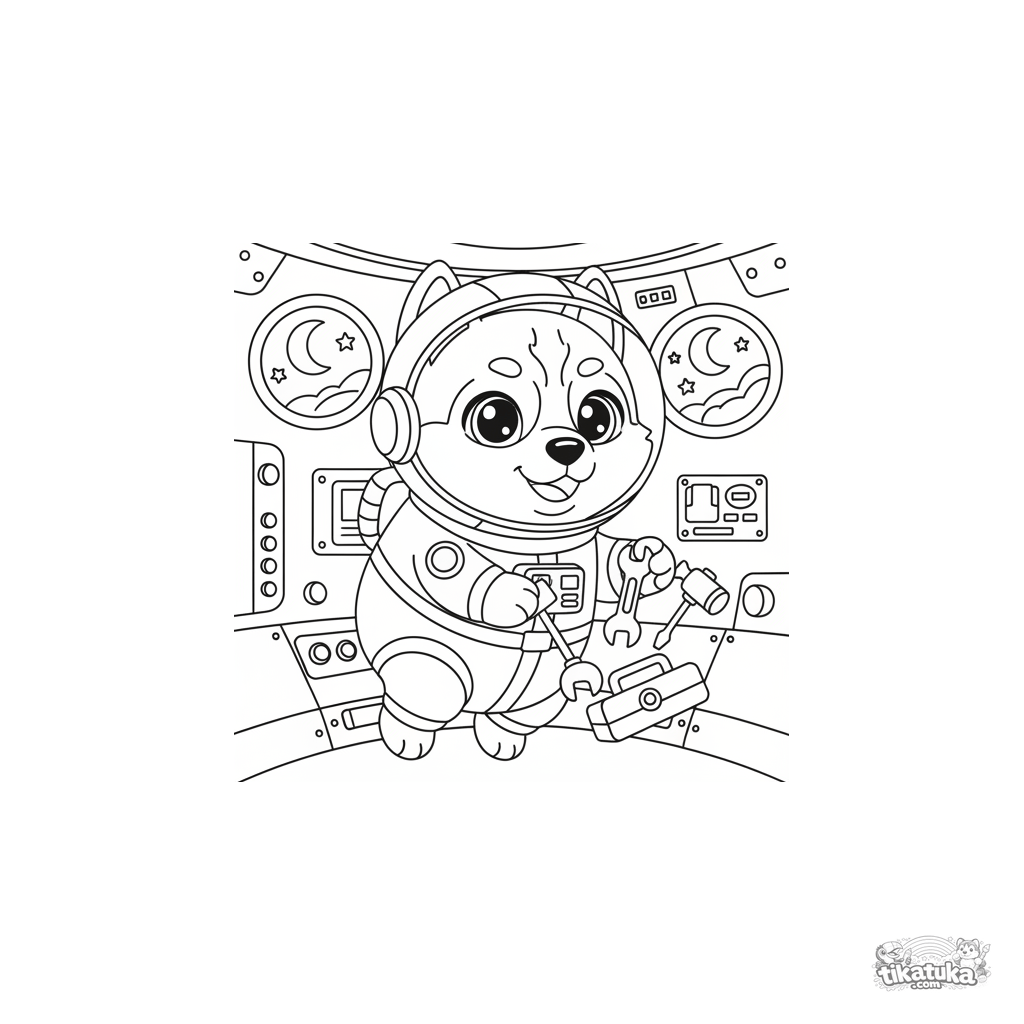 Husky astronaut coloring page for kids. A plush puppy in a spacesuit floats in a space station. Bright, simple shapes perfect for young artists.