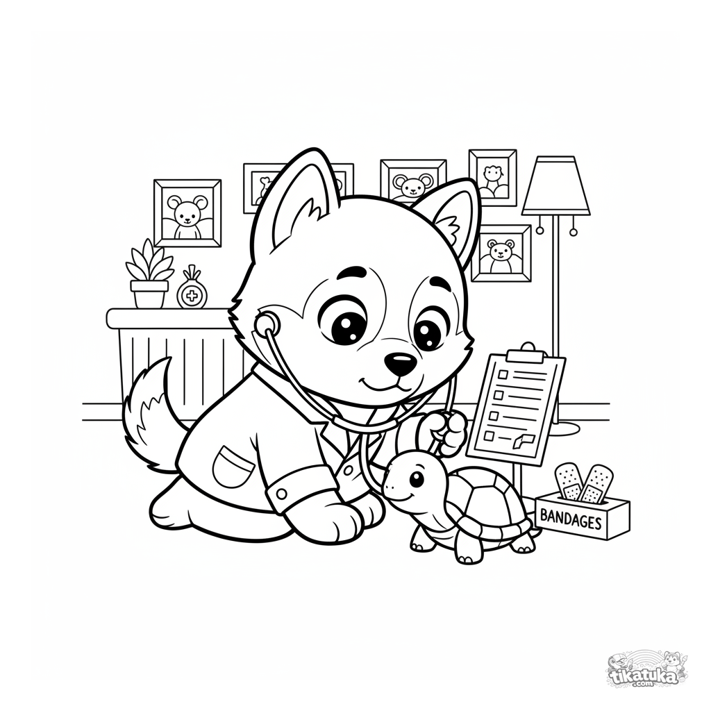 Coloring page of a husky veterinarian for kids 4-6. A puppy in a white coat listens to a turtle with a stethoscope in a cheerful animal clinic.