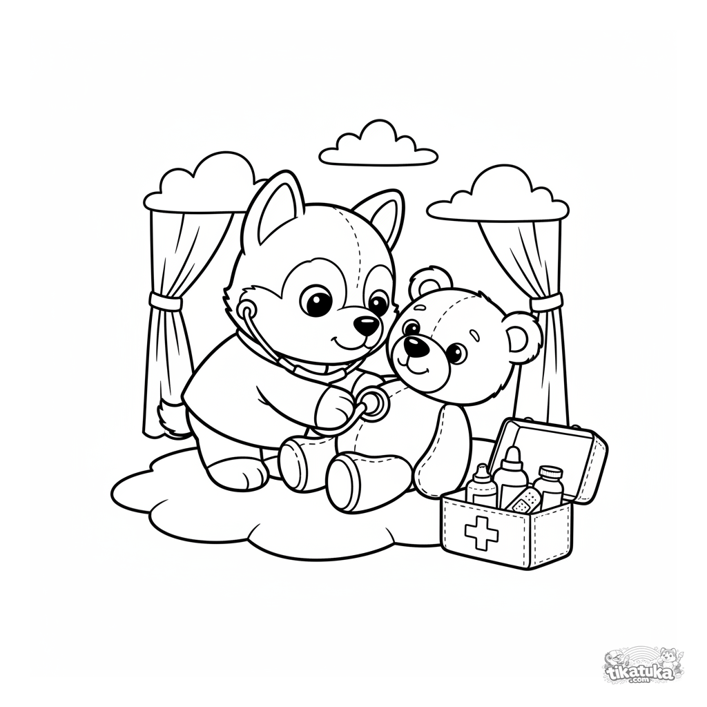 Coloring page of a husky veterinarian for kids. A plush puppy in a white coat treats a teddy bear. Kind and simple clinic scene.