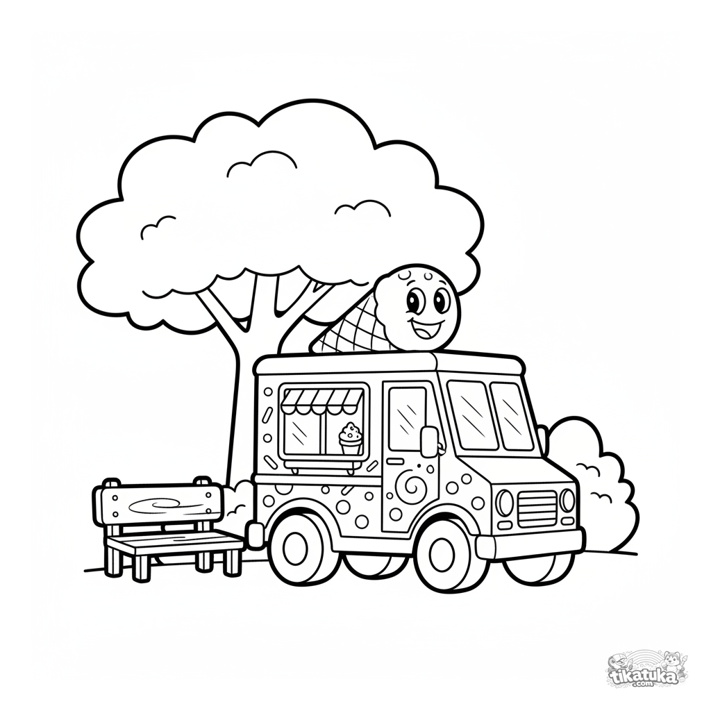 Toddler coloring page: a cheerful ice cream truck in the park. Simple vehicle shape with a big ice cream cone on top, large details.