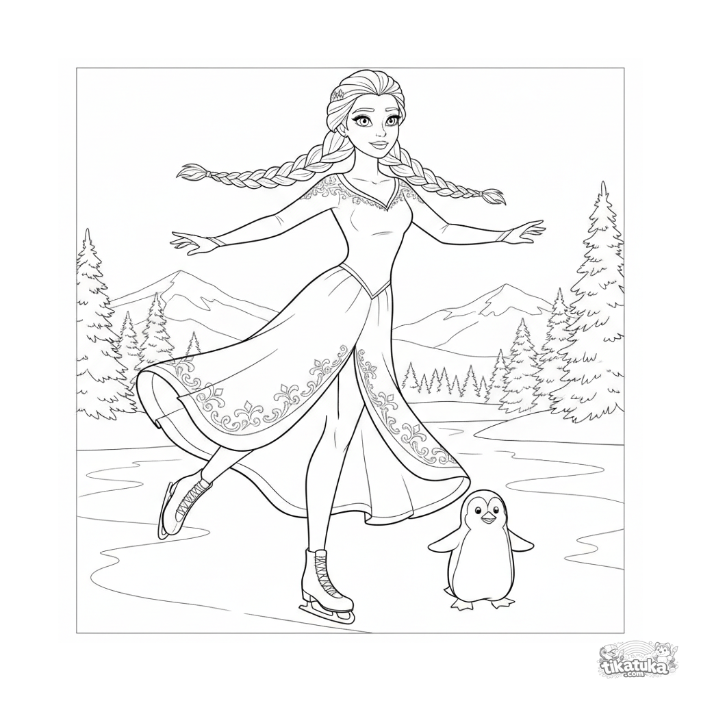 Detailed coloring page for ages 10-12: an ice princess in a sparkling dress gracefully skates on a frozen lake with a penguin companion. An intricate winter scene.