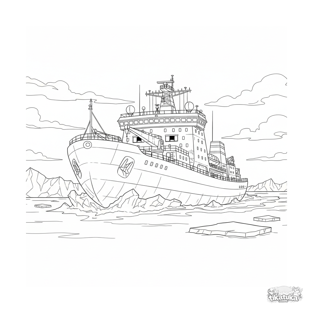 Detailed coloring page for older kids 10-12: a powerful icebreaker ship smashes through Arctic pack ice. Hull details, ice chunks, and machinery offer an engaging coloring challenge.