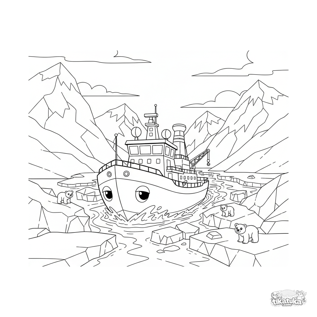 Coloring page for kids 4-6: a powerful icebreaker ship cutting through ice in a snowy fjord. Geometric shapes and an interesting scene for coloring.