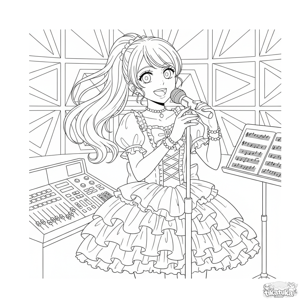 Detailed anime-style coloring page for ages 10-12: an idol singer in costume rehearses with a microphone in a professional recording studio, surrounded by equipment and sheet music.