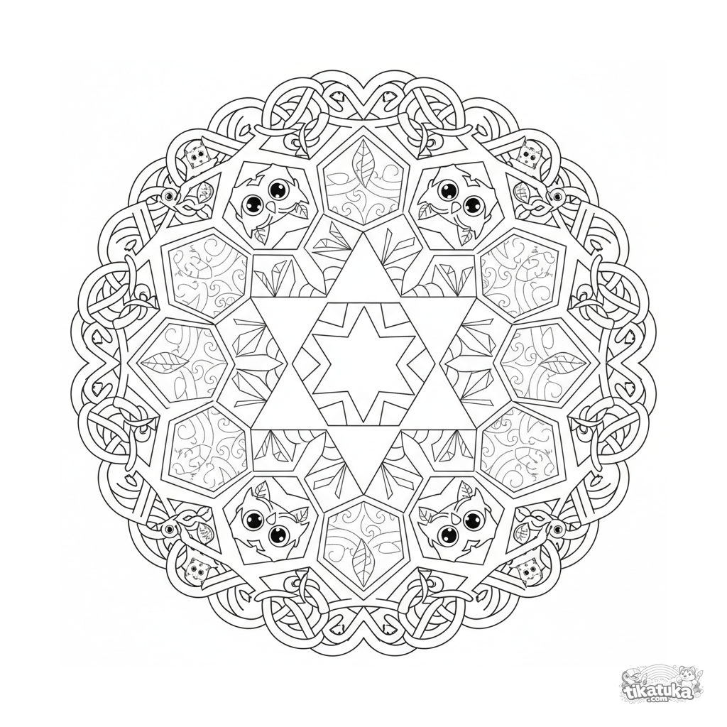Intricate geometric mandala coloring page for ages 10-12. Features an eight-pointed star center, rings of hexagons, diamonds, and Celtic knotwork. Symmetrical pattern.