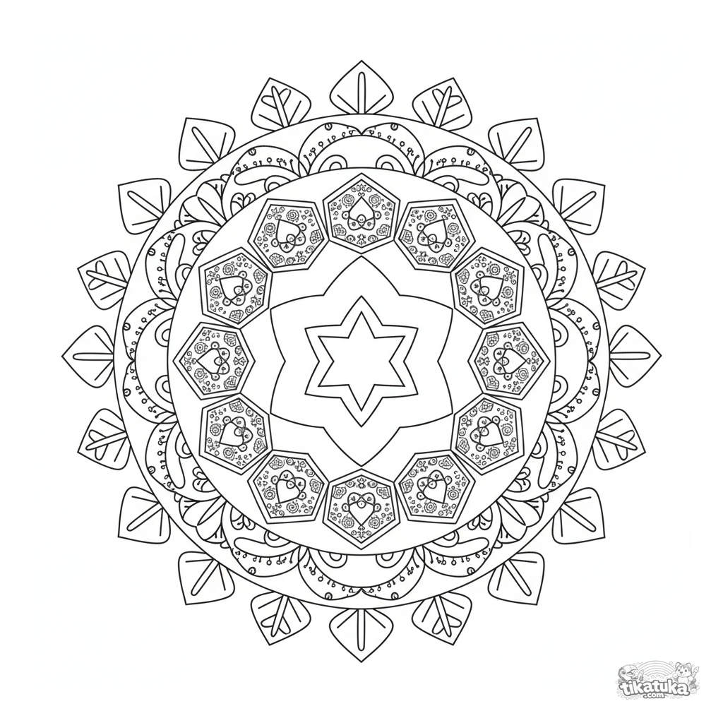 Intricate geometric mandala coloring page for ages 10-12. Eight-pointed star center, rings of hexagons and diamonds, symmetrical pattern with fine details.
