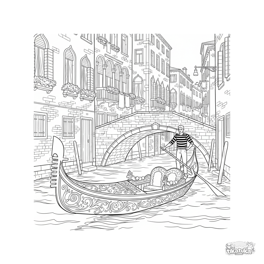 Intricate coloring page for older kids 10-12: a detailed Venetian gondola passes under a stone bridge. Architecture, gondolier. For patient artists.