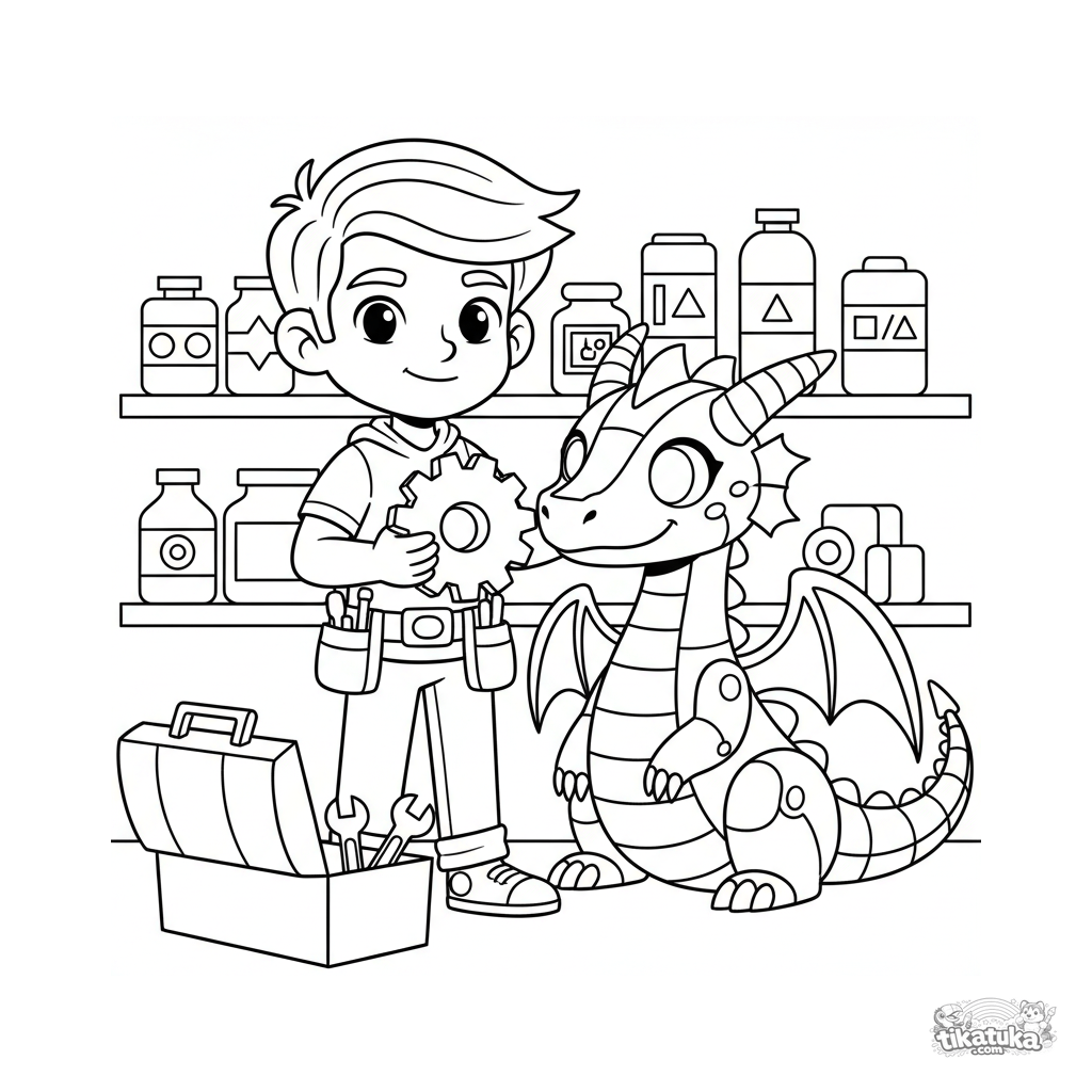 Coloring page for kids 7-9: a boy inventor and his loyal mechanical dragon in a secret lab. A scene of friendship and creativity.