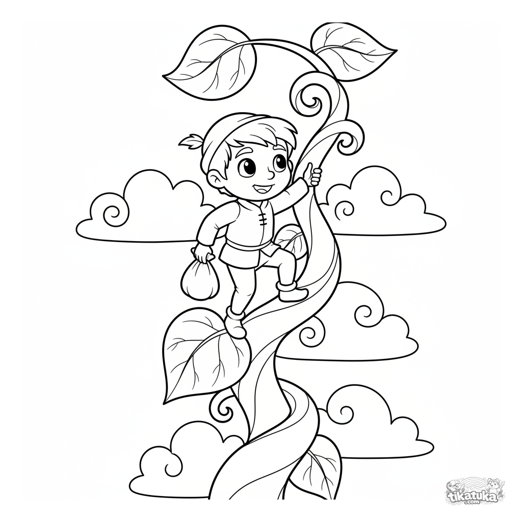 Coloring page for kids 4-6 from the fairy tale: Jack climbs a giant beanstalk into the sky. Dynamic scene with large leaves and clouds.