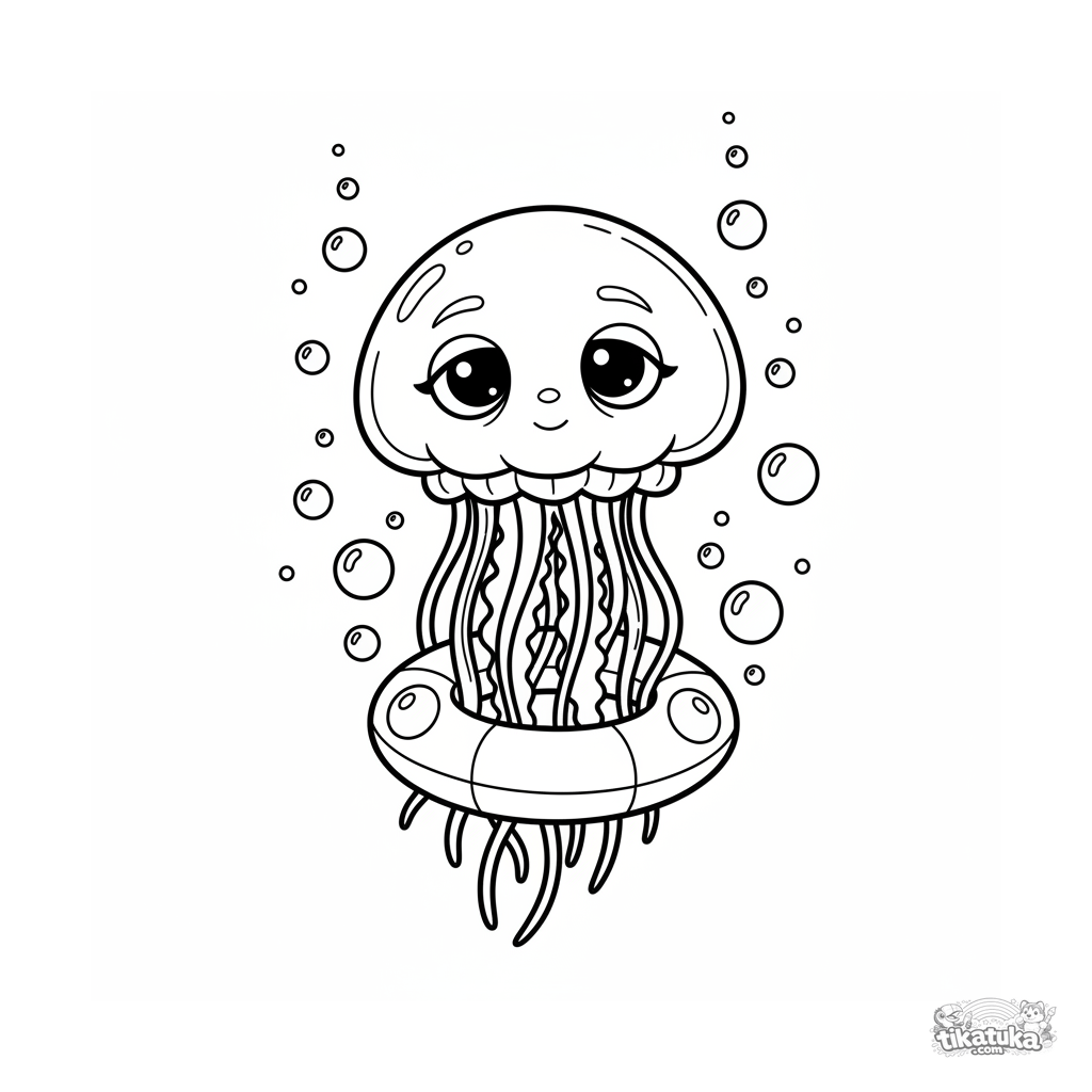 Coloring page for kids 7-9: a gentle jellyfish drifts in the water above an inflatable ring on the pool bottom, surrounded by a garden of bubbles. Moderate detail.