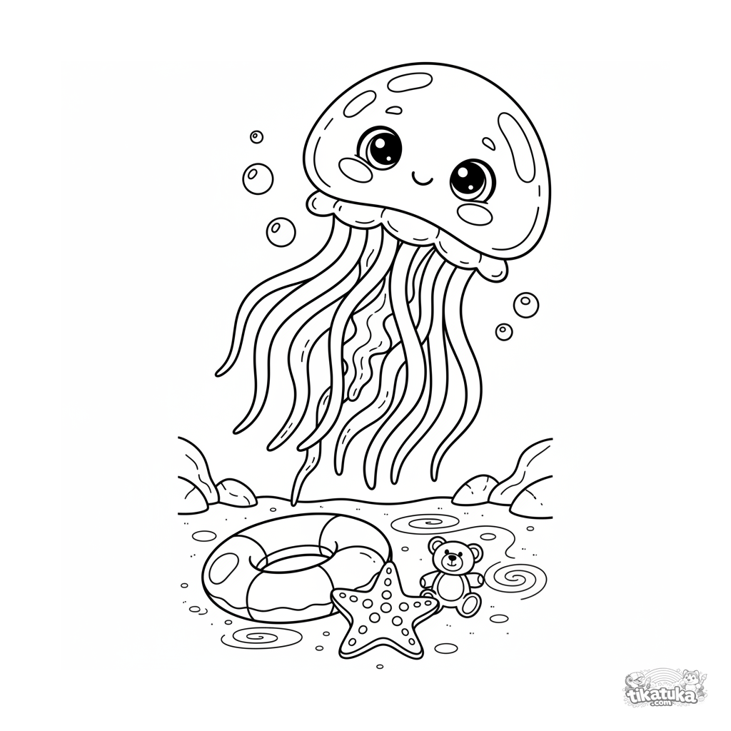 Coloring page for kids 7-9: a gentle jellyfish drifts over inflatable toys on the pool bottom. A scene with flowing lines and moderate detail.