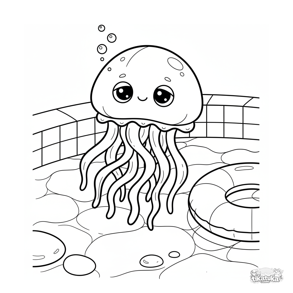 Coloring page for tweens 7-9: a gentle jellyfish drifts above the pool floor, with the shadow of an inflatable ring nearby. Flowing lines, peaceful scene.