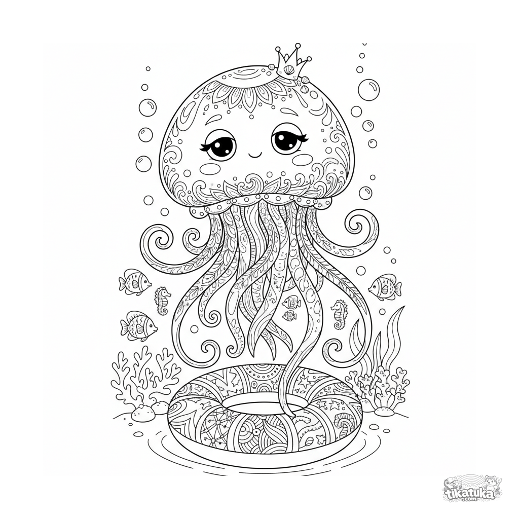 Detailed coloring page for older kids 10-12: a graceful jellyfish with long tentacles dances around a float ring on the pool floor. Intricate lines, flowing forms.