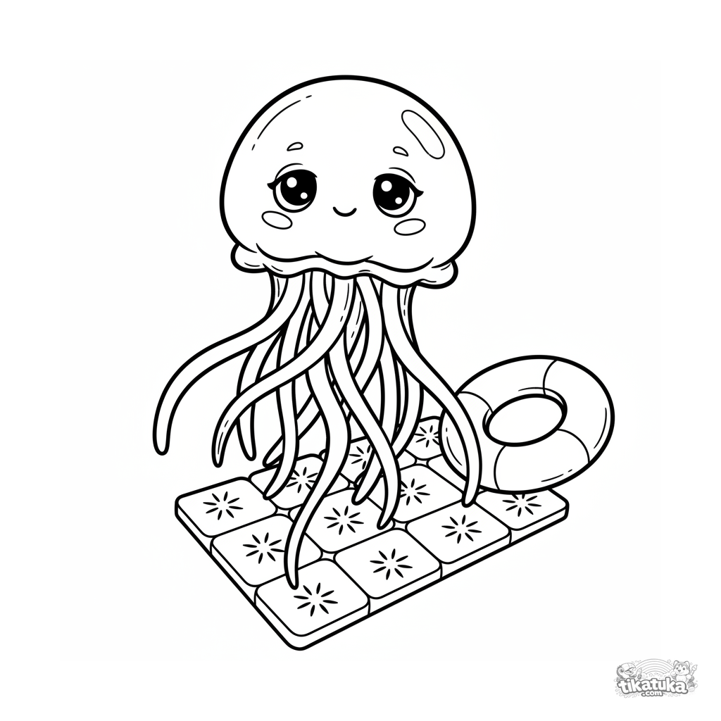 Coloring page for kids 4-6: a gentle jellyfish with long tentacles floats smoothly above the tiles on the pool bottom. Flowing lines and a calm expression.