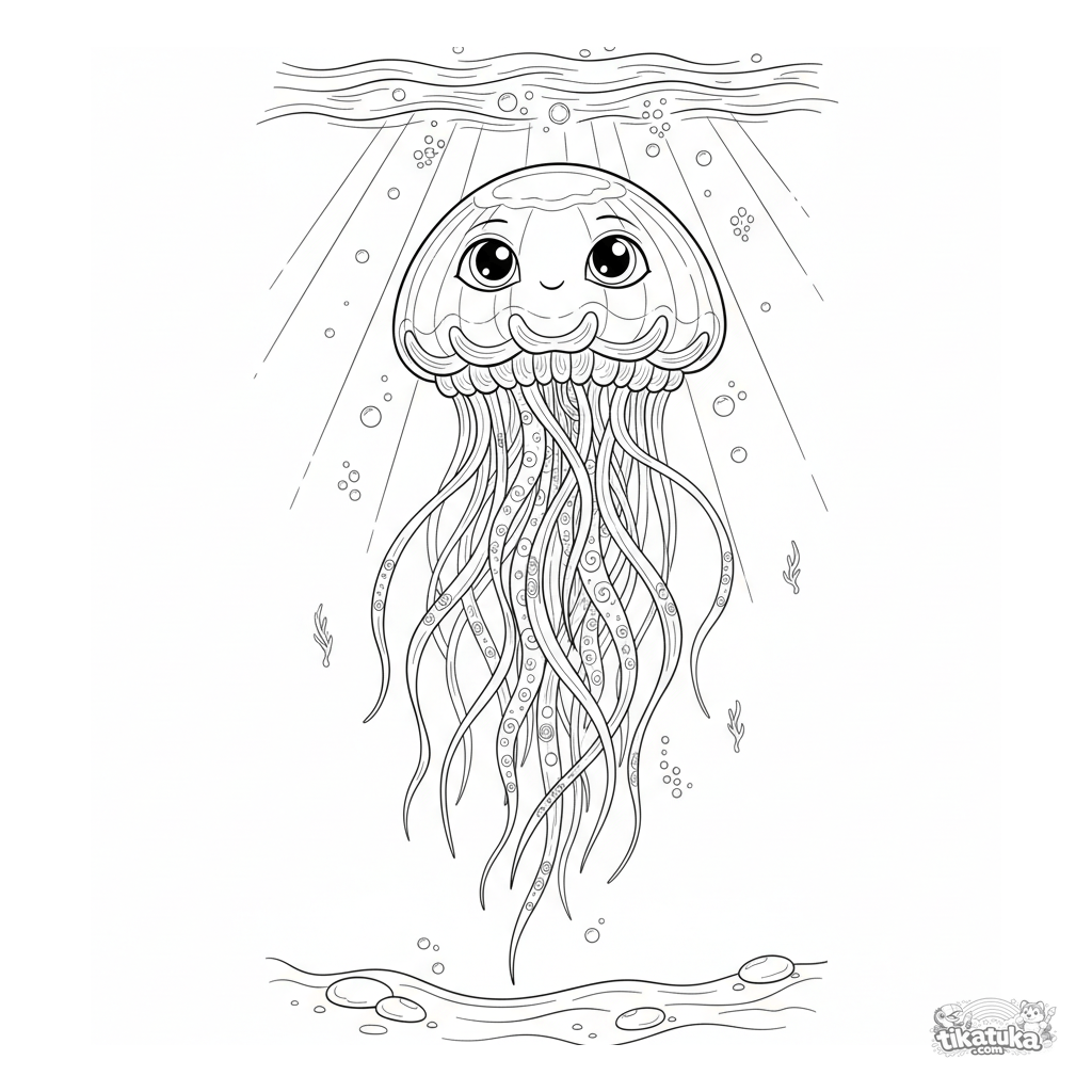 Detailed coloring page of a jellyfish pulsing in sunbeams near the surface of shallow water. Realistic field-guide style for older kids 10-12, perfect for focused coloring.
