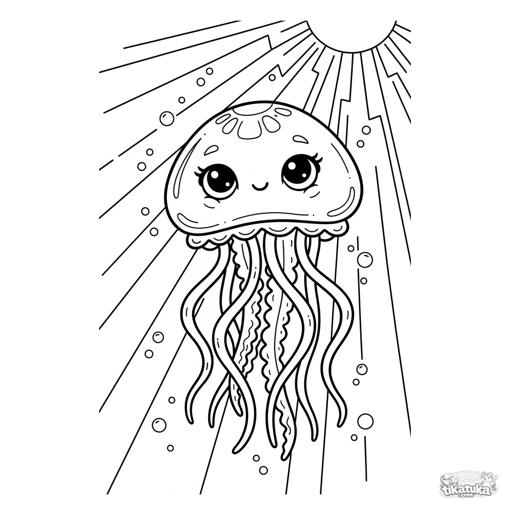 Coloring page for kids 4-6: a graceful jellyfish pulses gently upward through a sunbeam in the shallow water. Long tentacles, light, airy sketch style.