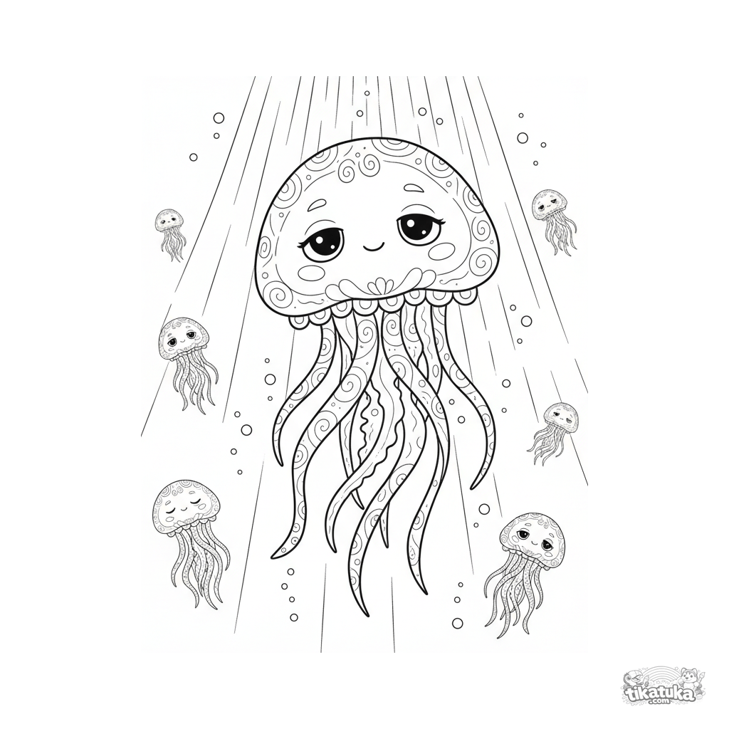 Artistic coloring page for ages 10-12: a jellyfish pulsing through a sunbeam in shallow water. Intricate lines, translucent effect, atmospheric scene.