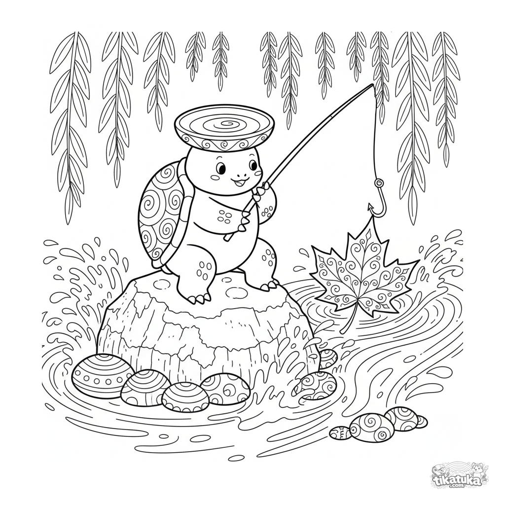 Humorous coloring page in Japanese folk style: a kappa tries to fish for a giant leaf in rushing river rapids. Detailed scene for ages 10-12.
