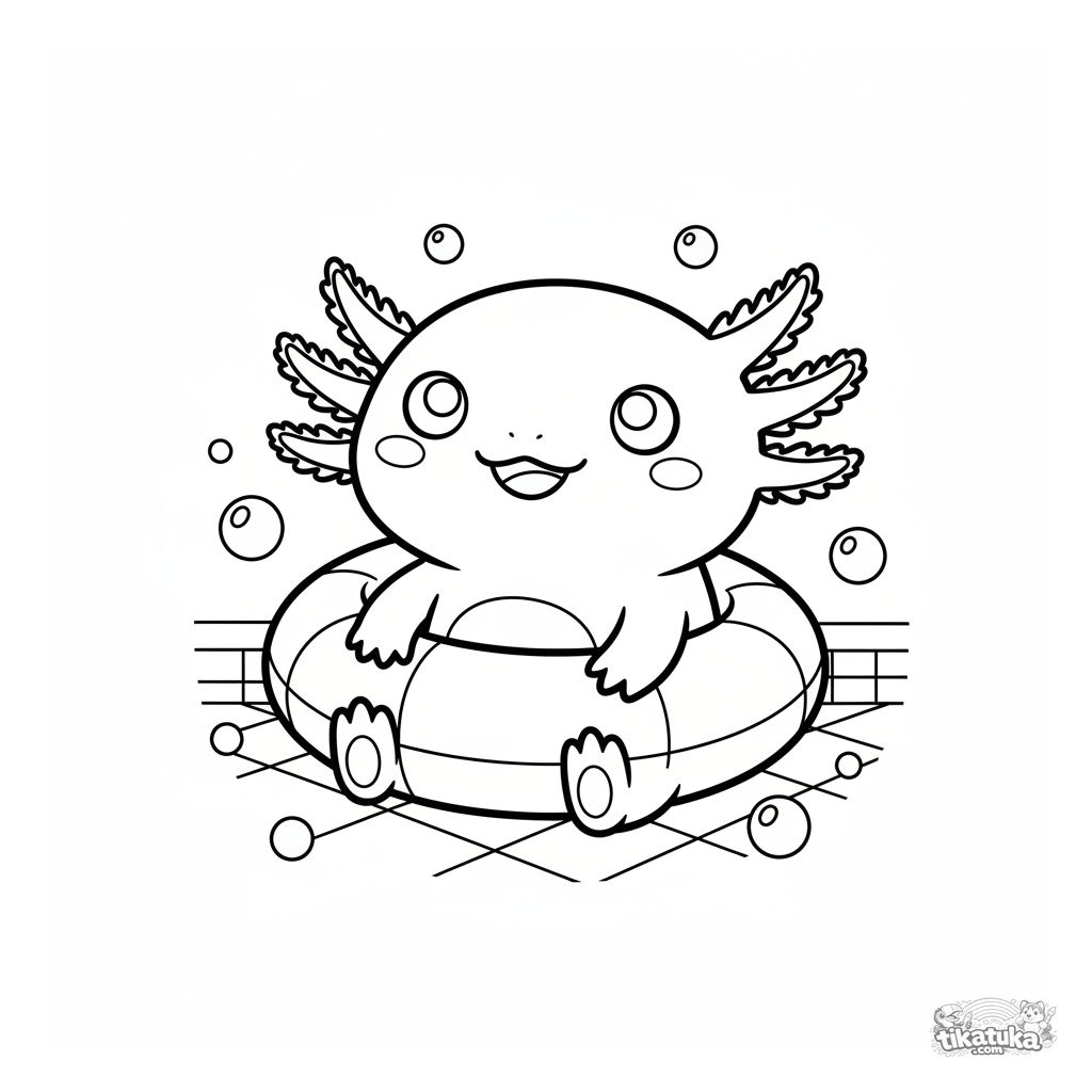 Coloring page of a cute axolotl on the bottom of a pool with an inflatable ring. For kids 4-6 years old. Adorable water creatures in a simple scene.