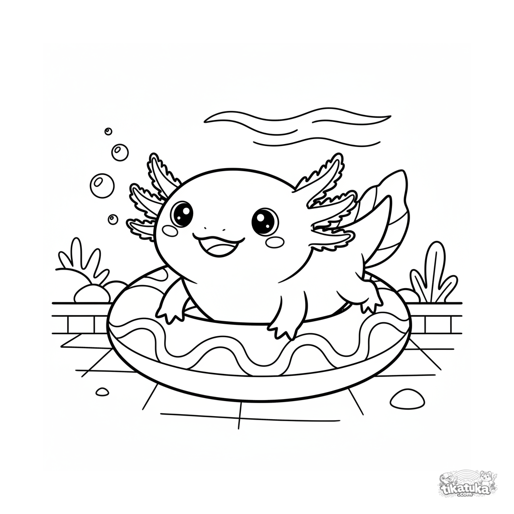 Coloring page for kids 4-6: a cute axolotl swimming under an inflatable ring at the bottom of a pool. Simple lines, fun scene for creativity.