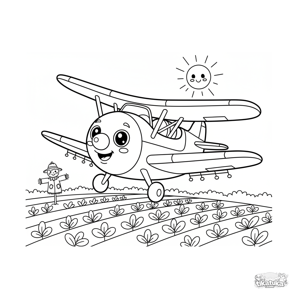 Coloring page for kids 4-6 in cute kawaii style: a tiny crop duster plane with a smile flies over a farm field. Bright, friendly shapes.