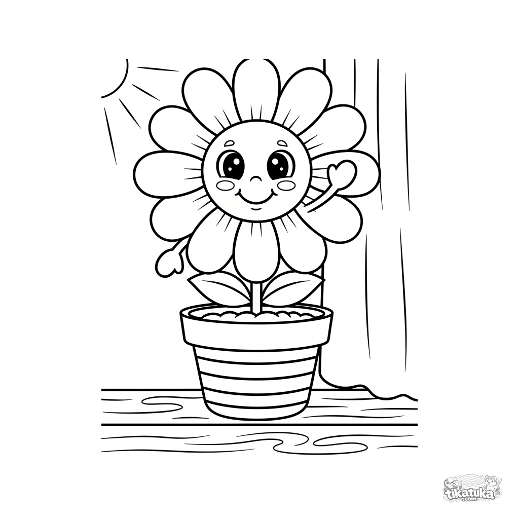 Simple coloring page for toddlers 2-3: a smiling daisy in a pot on a windowsill. Large shapes, thick outlines, minimal details.