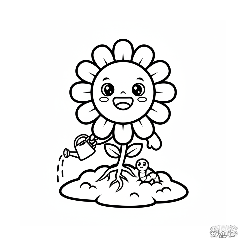 Simple coloring page for toddlers 2-3: a smiling daisy with leaf arms waters itself from a watering can. Large clear shapes, few details.