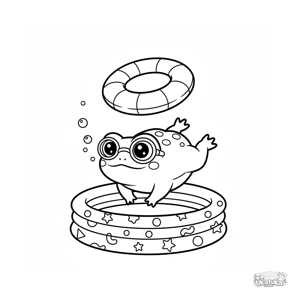 Coloring page for tweens 7-9: a cute kawaii frog in swim goggles dives towards the bottom of an inflatable pool, creating bubbles. Dynamic pose and simple background.