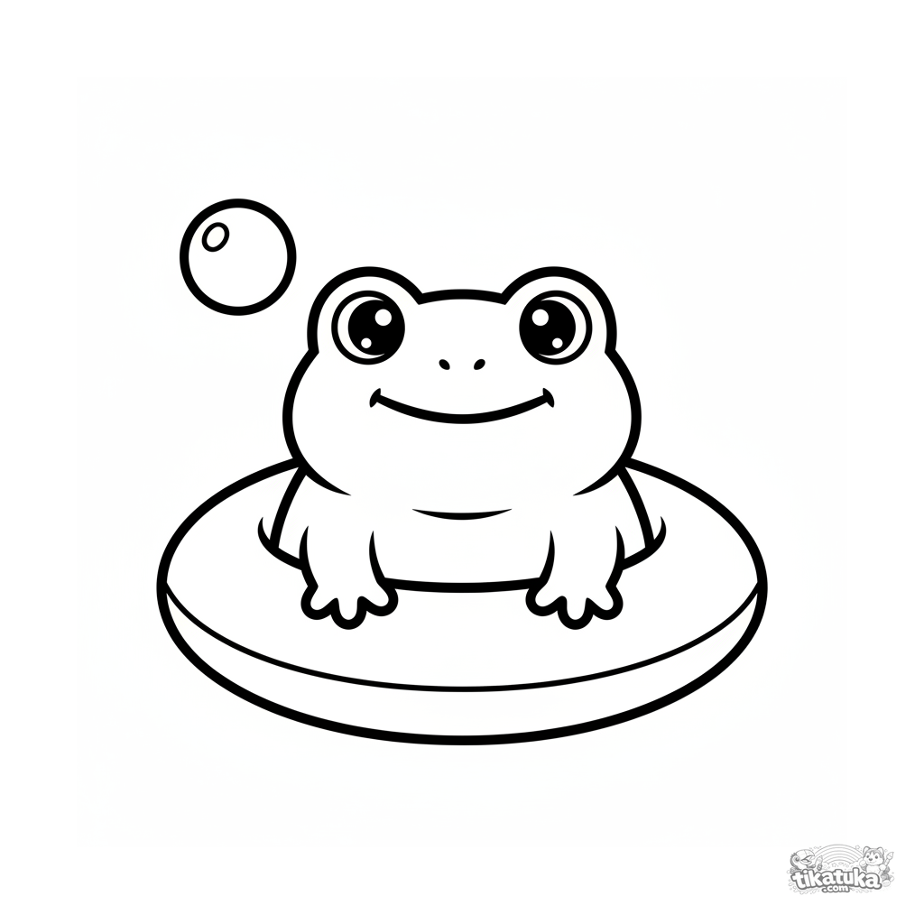 Simple coloring page for toddlers 2-3 years: a cute frog peeks from an inflatable ring at the pool bottom. Large shapes and wide margins for first coloring experience.