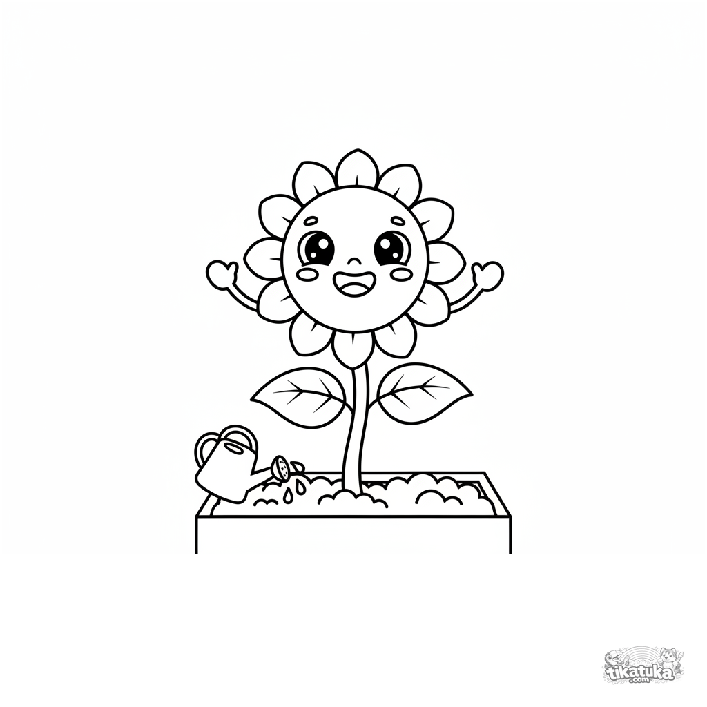 Simple coloring page for toddlers 2-3: a happy sunflower with a face in a garden bed. Large shapes, wide margins, perfect for first crayons.
