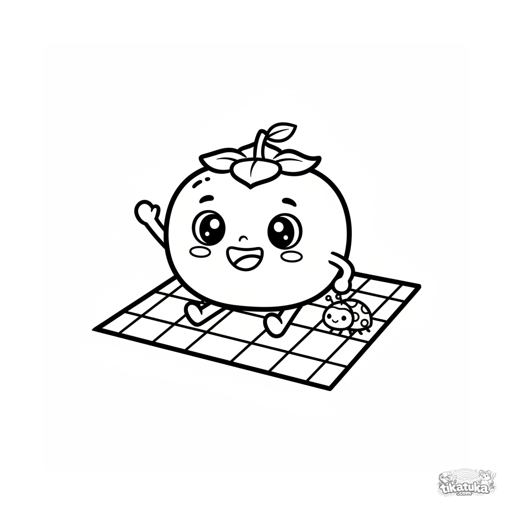 Toddler coloring page: a kawaii persimmon with a smile waves from a picnic blanket. Simple shapes, wide margins for easy coloring.