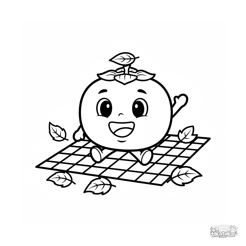 Toddler coloring page: a kawaii persimmon character with a smile waves its tiny arms on a checkered picnic blanket. Simple shapes with wide margins for easy coloring.