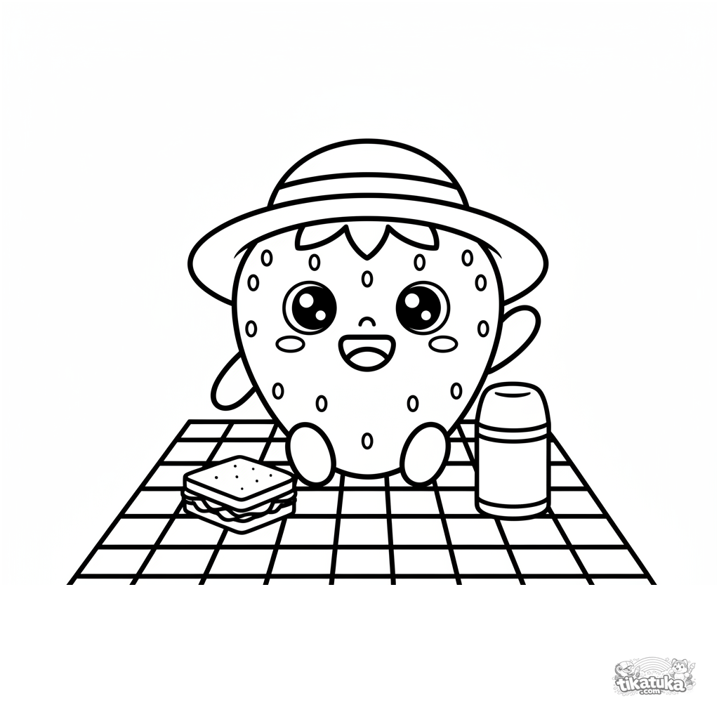 Toddler coloring page: a cheerful strawberry with a hat waving from a picnic blanket. Simple shapes and wide margins for easy coloring.