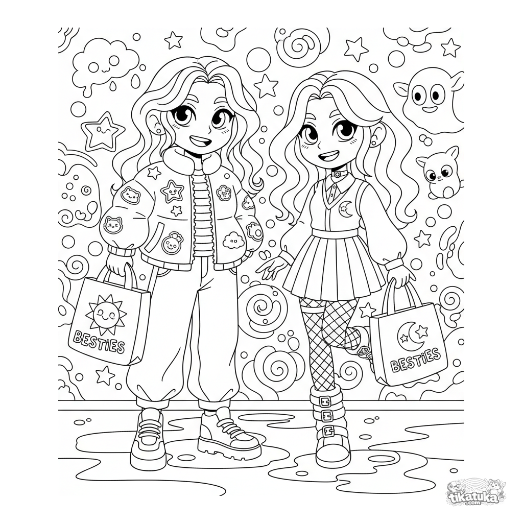 Coloring page for kids 7-12: a duo in vibrant kawaii street fashion posing against a graffiti wall. Detailed scene with bags, patches, and character art.